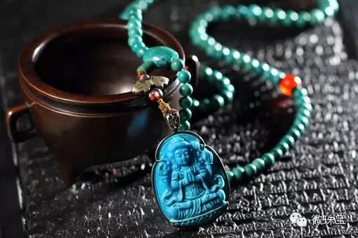 绿松石因为含铜量的不同呈现由绿到蓝的不同色彩,或夹杂黑色等杂质,但整体温和,让人心情平静。