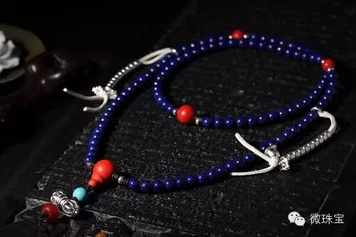 青金石犹如景泰蓝工艺的美感,本身表面偶有瓷器光泽,佩戴冰凉很舒服,内含黑点为铁矿,也有利于吸热消暑。