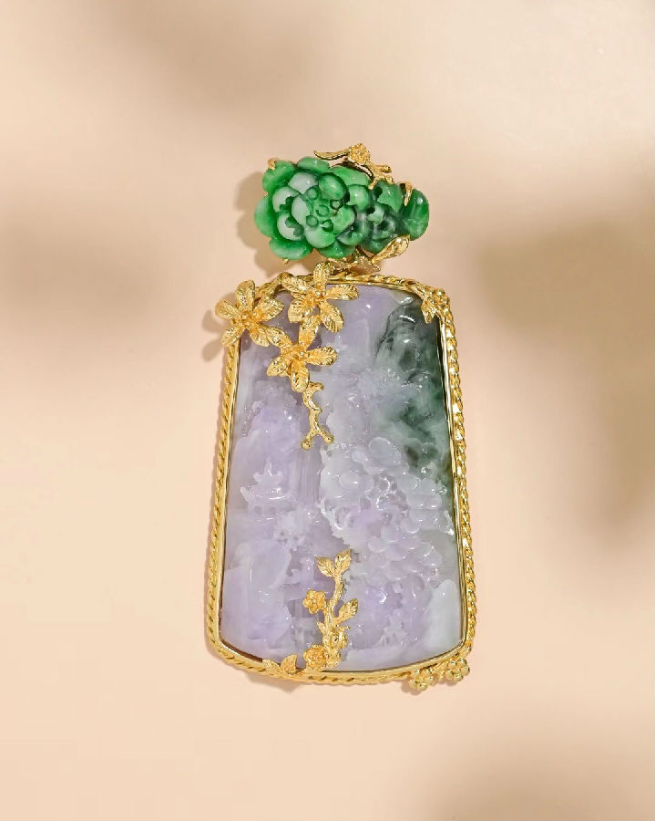 翡翠组合式吊坠是一种由多个不同形状和风格的翡翠元件组成的吊坠。这些组合采用精细的金属镶嵌工艺,还常搭配镶嵌珍珠、钻石、宝石等等。视觉上给人一种高贵华美的感觉,可以根据自己的喜好来挑选款式,也可以选择购买裸石,自己找专店设计镶嵌,这样的吊坠不仅时尚,还独特赋有心意。